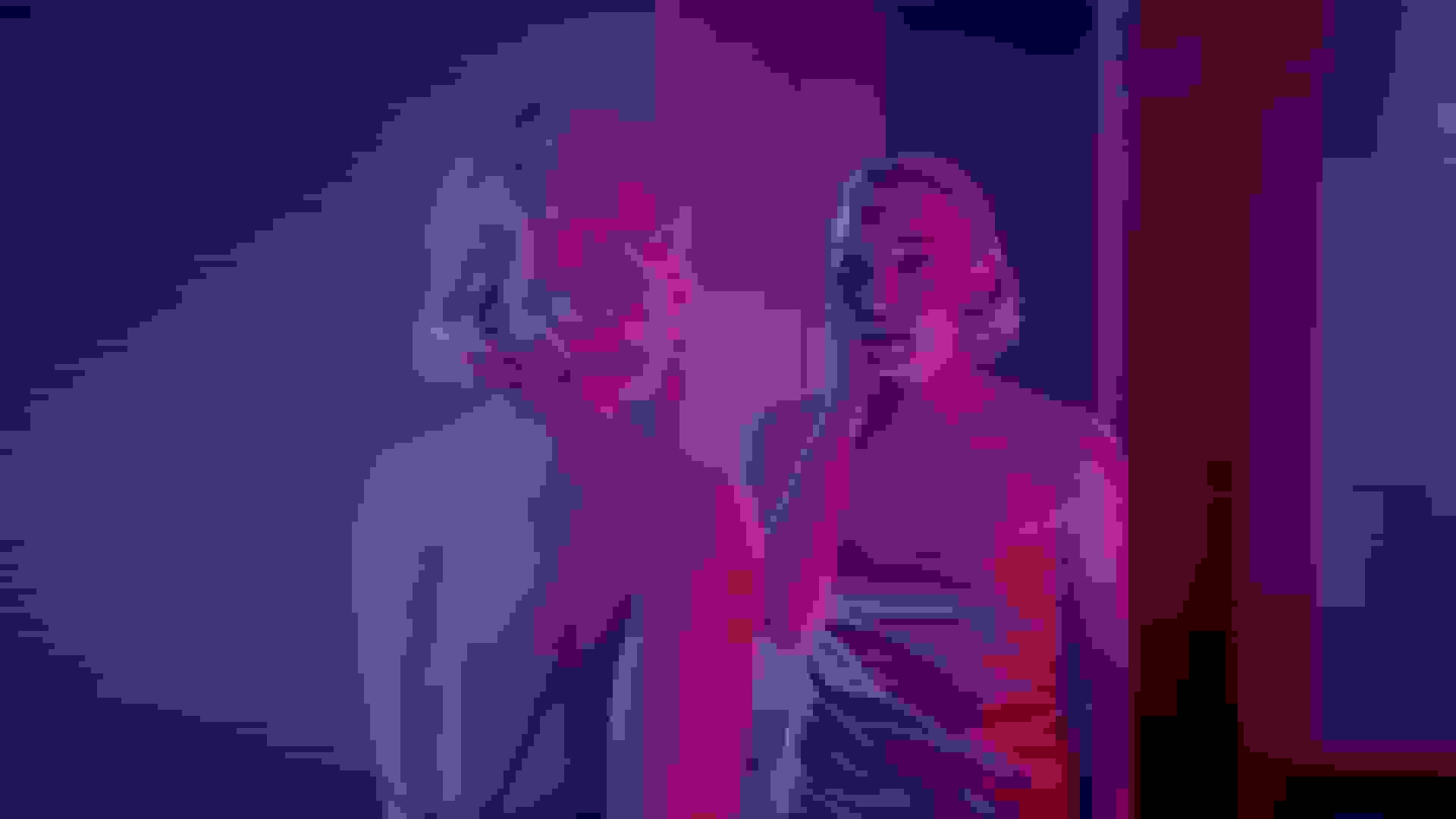 I always imagined the VR world being lit differently. Aaron Reid and Gaffer Lee Parfait gave me the luxury of choice and what we found just felt right. I learned that those colours are called ‘bisexual lighting’ after the shoot. The sound design separates the two worlds really well also.